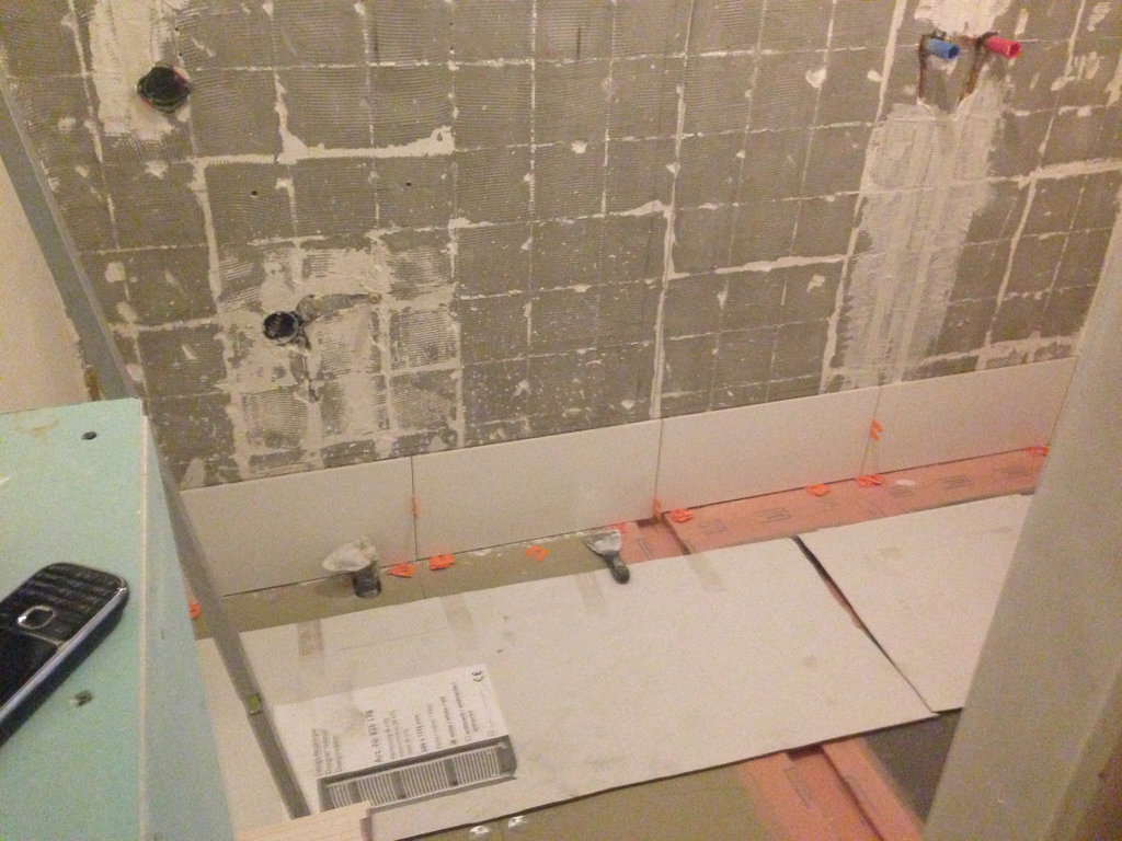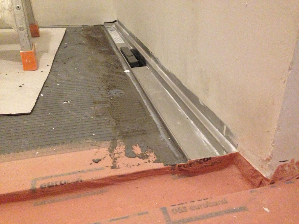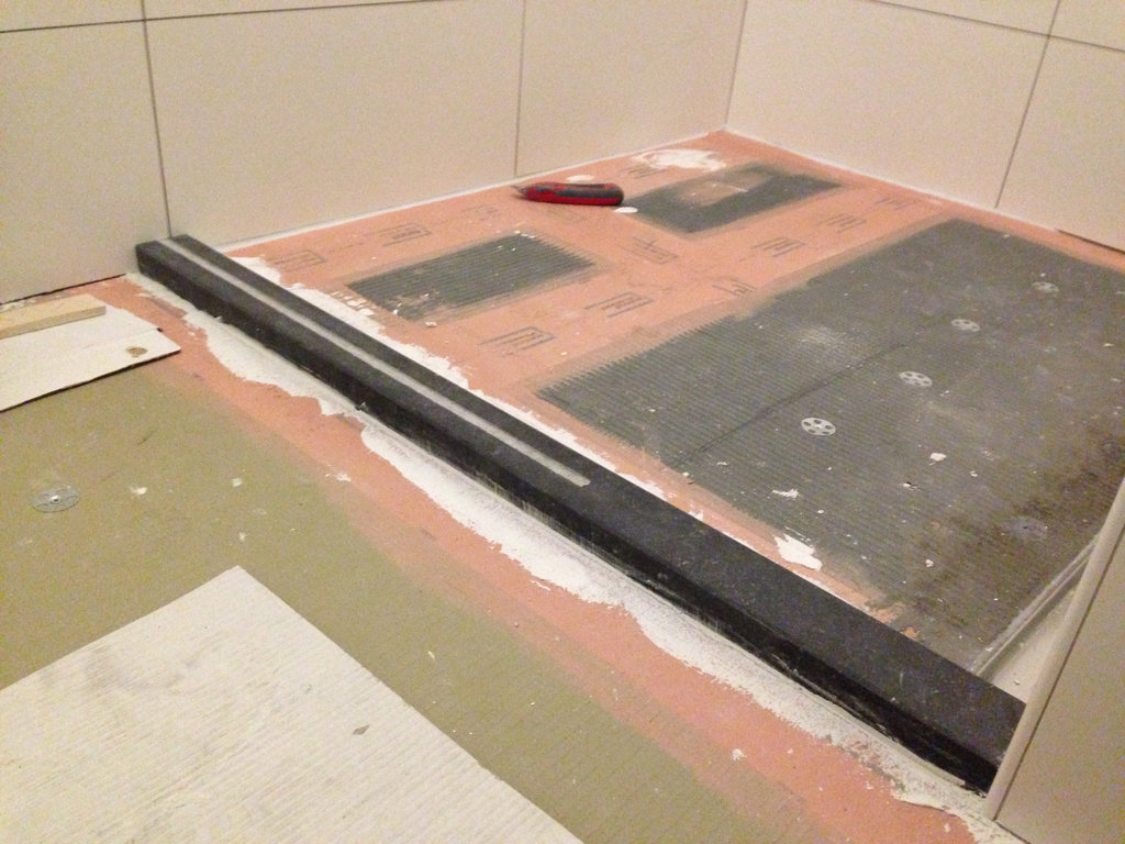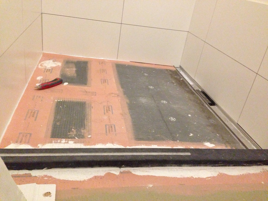 Na de gehele oude badkamer verwijderd te hebben, is een waterpas basissysteemvloer aangelegd. Deze vloer bestaat uit 18 mm underlayment platen, en speciale 30 mm WEDI-platen, welke geschikt zijn voor gebruik in vochtige ruimtes. De gehele dikte van de vloer bedraagt nu slechts 60 mm. De overgang van vlak naar afschotgebied is opgevangen door een strook 70 mm hardsteen, voorzien van sponning voor de geplaatste vaste glazen douchewand.