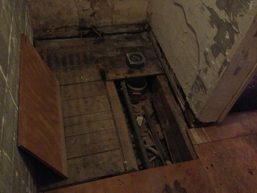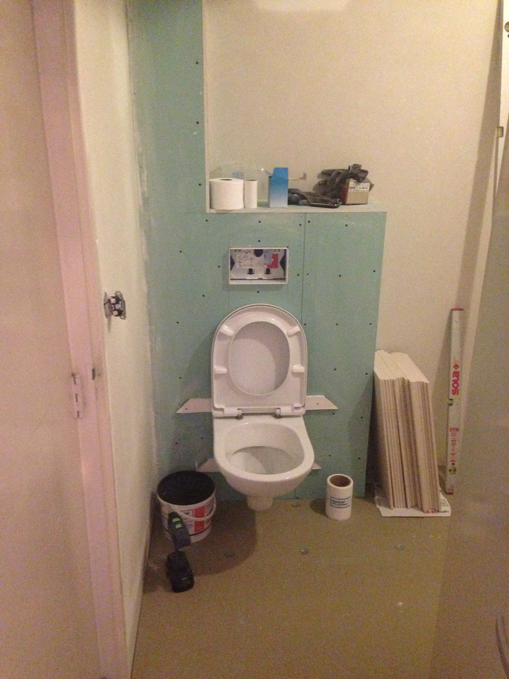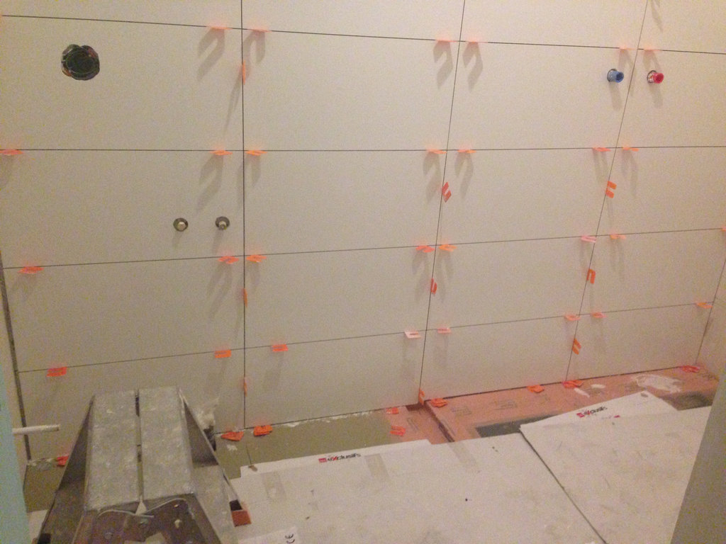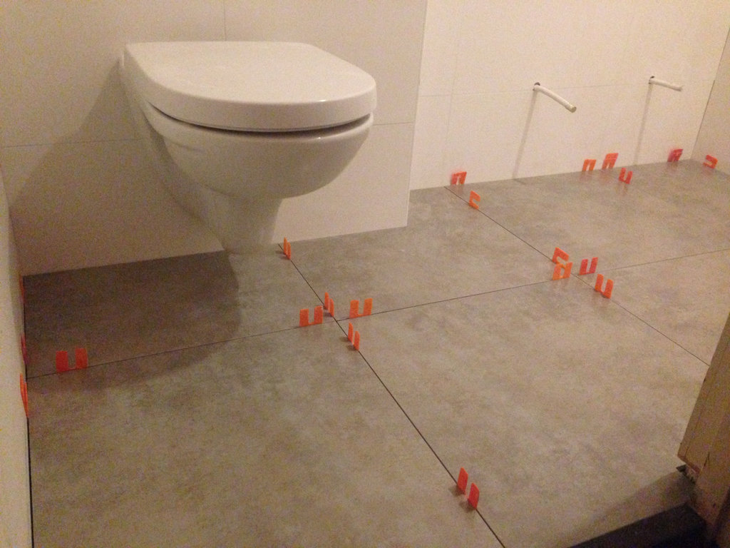 Na de gehele oude badkamer verwijderd te hebben, is een waterpas basissysteemvloer aangelegd. Deze vloer bestaat uit 18 mm underlayment platen, en speciale 30 mm WEDI-platen, welke geschikt zijn voor gebruik in vochtige ruimtes. De gehele dikte van de vloer bedraagt nu slechts 60 mm. De overgang van vlak naar afschotgebied is opgevangen door een strook 70 mm hardsteen, voorzien van sponning voor de geplaatste vaste glazen douchewand.