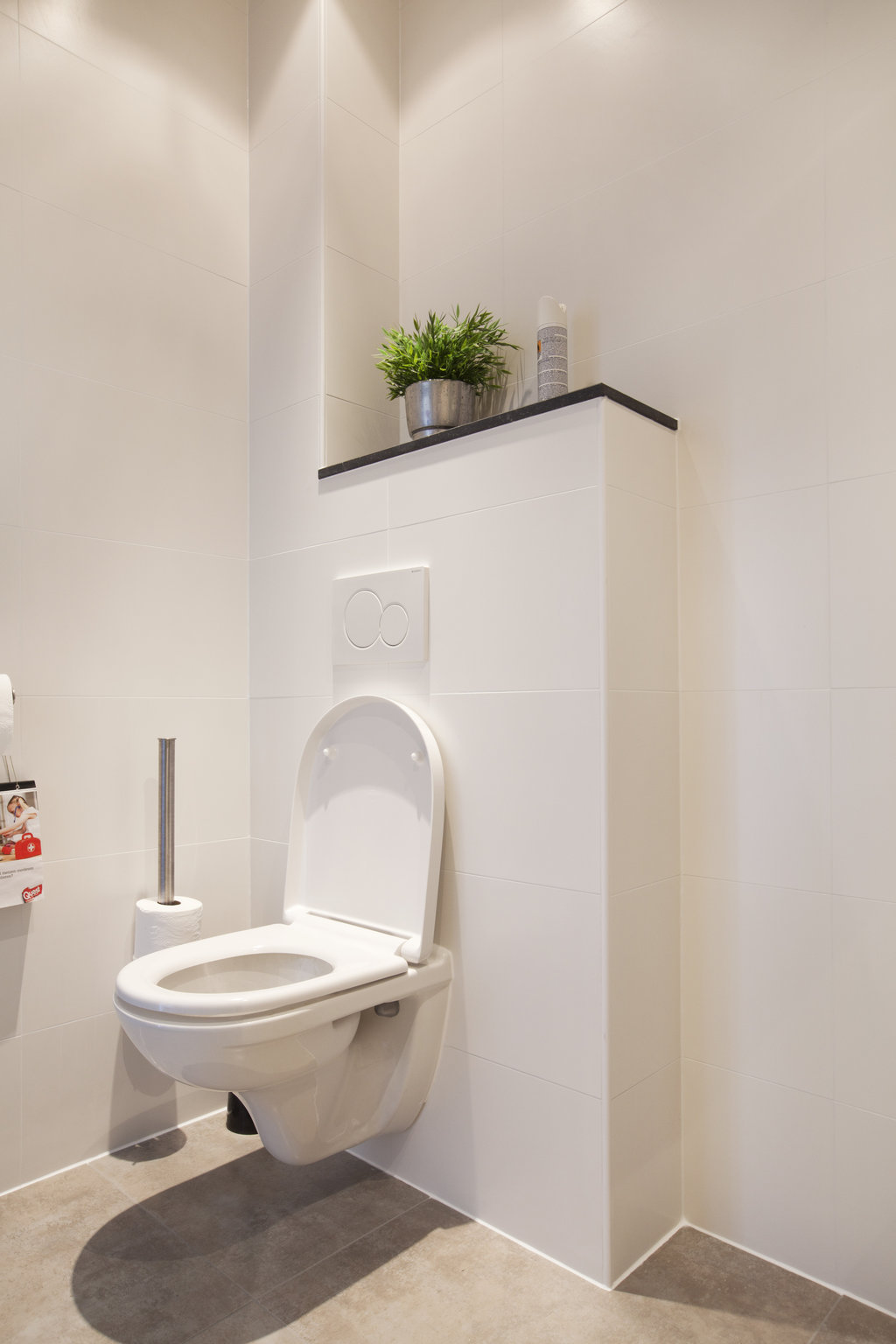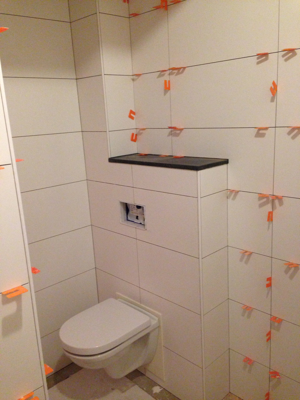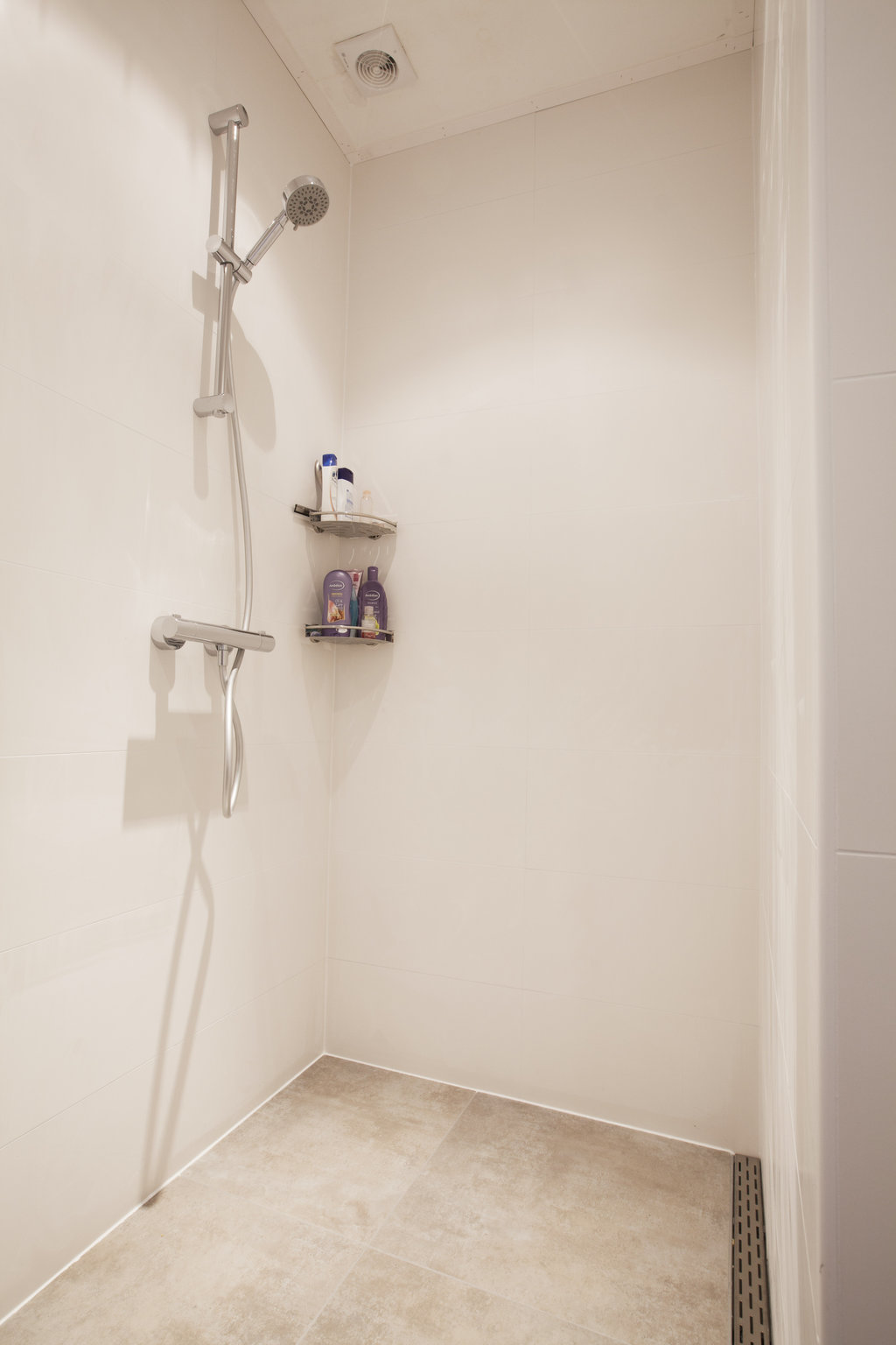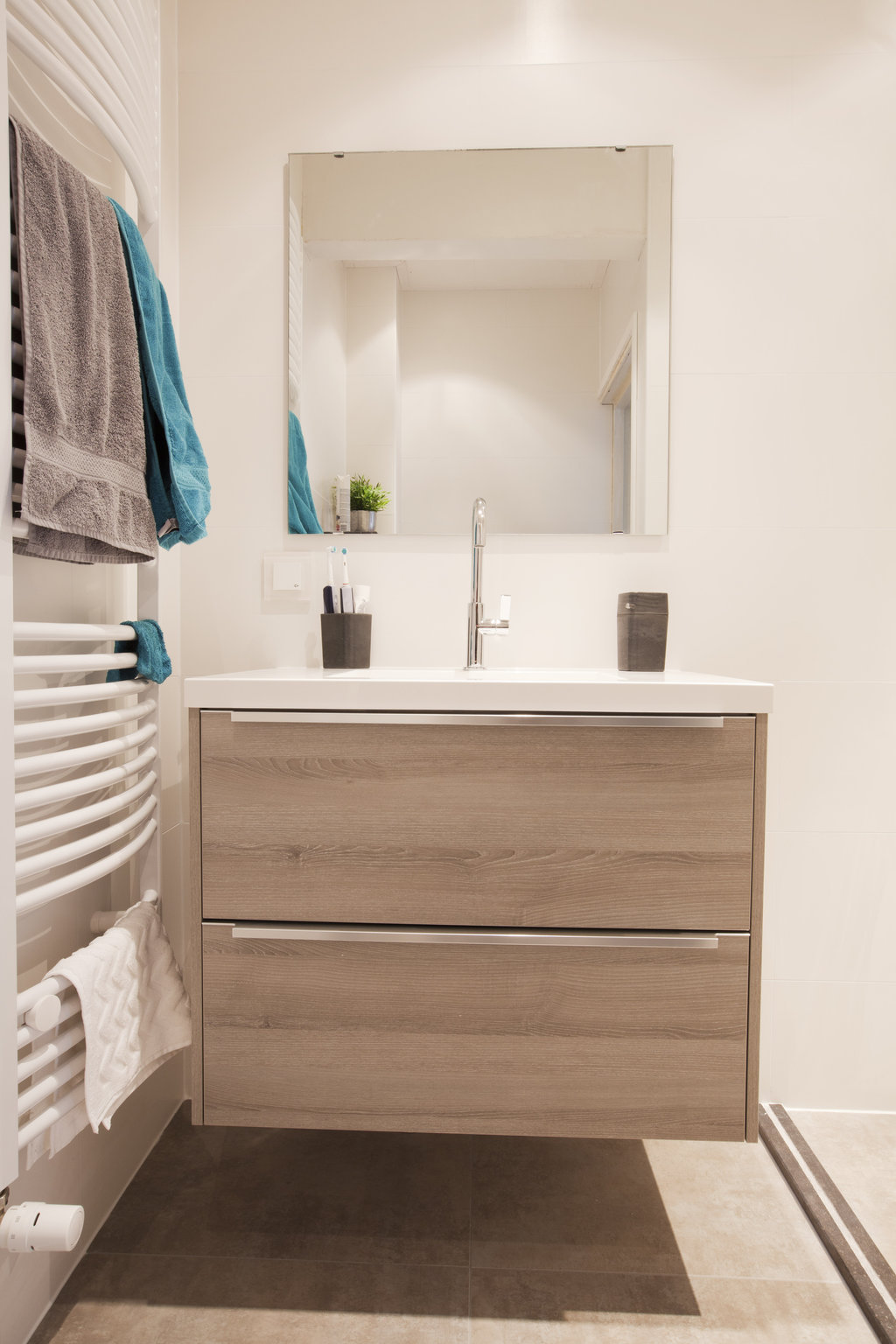 De vloer is betegeld met een 60 x 60 cm gevlamde tegel, en de wanden zijn tot aan het plafond voorzien van 30 x 60 cm gecallibreerde (haakse), matte tegels. De afwatering vindt plaats door middel van een RVS Easydrain afvoergoot. De gehele vloer is vervolgens gevoegd met een 2 componentenvoeg, in bijpassende kleur. Uiteindelijk is een badkamermeubel met wasbak en kraan, een badkamerradiator, een thermostaatkraan met glijstangset en een hangend toilet gemonteerd.